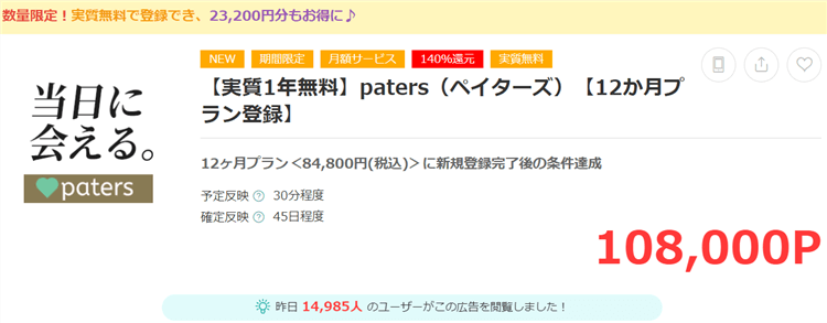 ペイターズの12か月プランを利用することでモッピーのポイントが108,000P貰えるんです!!