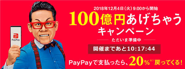 ※ キャンペーン期間中であっても対象のキャンペーンにおいて、PayPay株式会社の負担する還元金額が100億円に達した場合、本キャンペーンは途中終了いたします。また、還元金額を追加する可能性があります。その場合はPayPayホームページにて事前告知を予定しています。