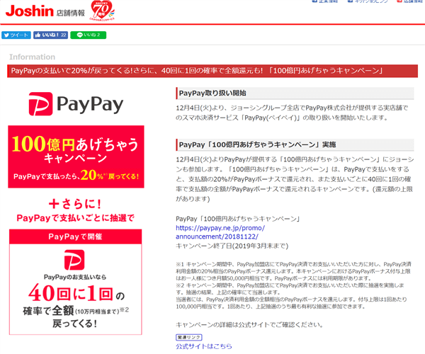 ジョーシンがPayPayと100億円キャンペーンに対応!dポイントも貯まる!