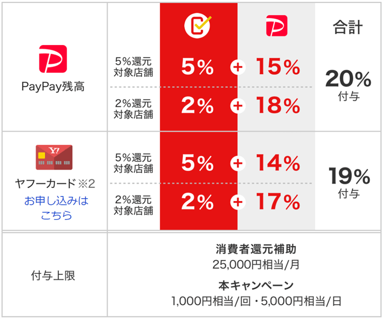 ※ 本キャンペーンによる付与対象者に対しては、PayPayとの関係での消費者還元補助による付与に加えて、付与するPayPayボーナスが最大となるよう、PayPay利用特典、同時開催中キャンペーン(PayPayチャンスを含む)による付与が自動的に割り当てられます(ただし、当社が指定しない限り複数の総付キャンペーンが重複して適用されることはございません)。
