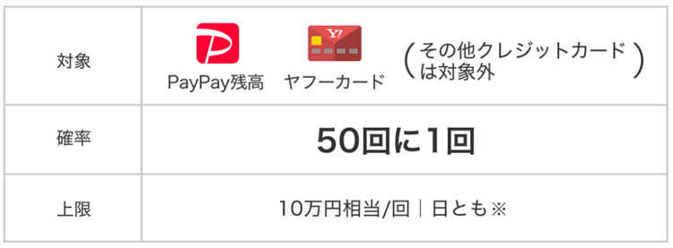 ※ PayPayのオンライン決済を利用しているサービスでのお支払い、PayPay請求書払いでのお支払い、およびソフトバンク・ワイモバイルでの携帯電話料金のお支払いは、本キャンペーンの対象外です。