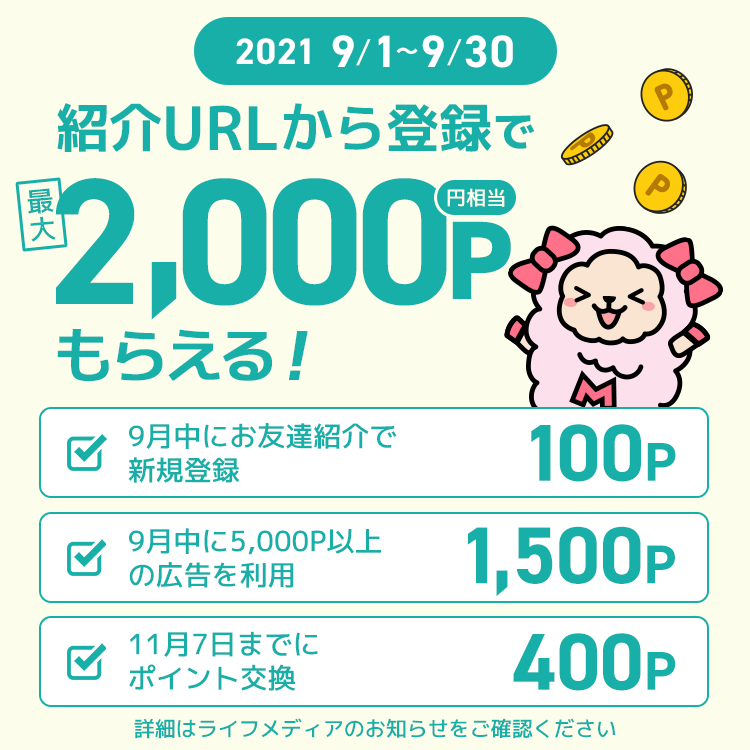 現在ライフメディアでは新規入会で最大2,000ポイントが貰えちゃいます!!