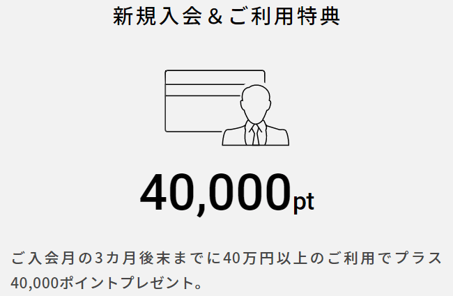 ご入会月の3ヵ月後末までに40万円以上のご利用でプラス40,000ポイントをプレゼント