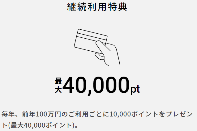 継続特典もかなりお得!前年実績100万円利用事に10,000ポイントが貰える!最大40,000ポイントまで!!