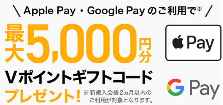 対象期間中に、対象カードに新規入会し、かつカード入会月の2ヵ月後末までに、新規入会した対象カードでApple Pay・ Google Pay を1回以上ご利用いただくと、5,000円分のVポイントギフトコードをプレゼントとなります!!