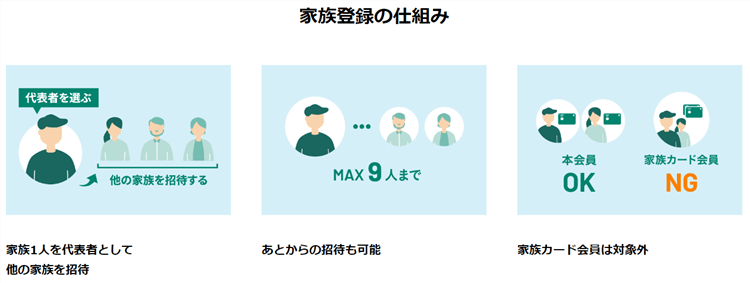 代表者(主会員)を除いて最大家族(従会員)9人まで登録ができます。なお、本サービスには同一人物が重複して登録することはできません。