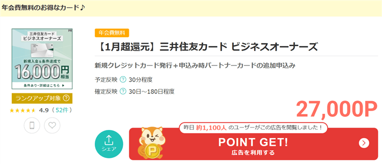 三井住友カード ビジネスオーナーズで27,000ポイント!更に最大16,000円相当のVポイントが貰える!!