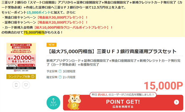 【三菱UFJ銀行】「スマート口座開設」アプリから+証券口座開設完了+預金口座開設完了+新規クレジットカード発行完了(カード受取必須)+作成した証券口座で最大75,000円相当が激アツ!!