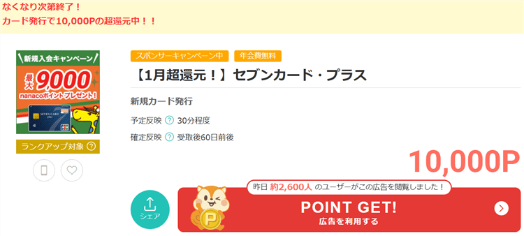 セブンカード・プラスが新規発行10,000Pで激アツ!更にカード側キャンペーンで最大9,000円相当!