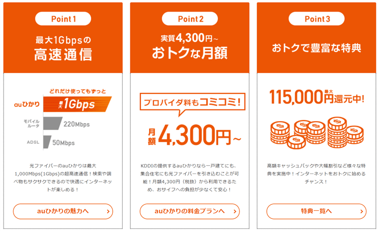 auひかりは他社乗換えに掛かる解約金も一部負担してくれたり、大量のキャッシュバックキャンペーン(最大10万円オーバー!)なので、めっちゃおすすめできます!