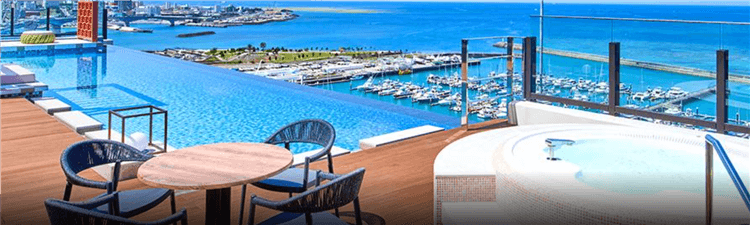 ホテル内には、レストランやスパの他、2 階と最上階に 2 つのインフィニティプールを設け、ホテルの至る所から宜野湾の海の景色をお楽しみいただける造りとなっております。