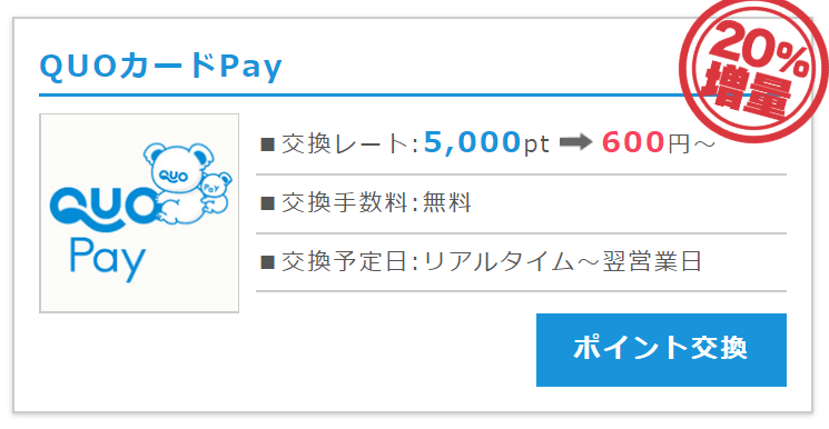 現在各ポイントサイトからQUOカードPayに交換をすると20%増量となっています。