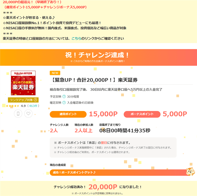 - 楽天証券新規口座開設で10,000P→20,000P貰える!