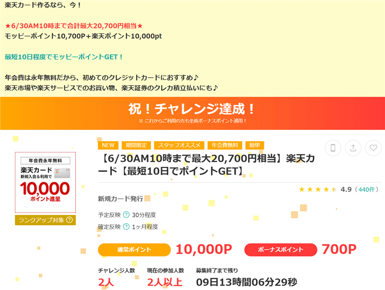 「モッピー」の楽天カード新規発行で貰えるポイントをまとめるとこうなります。