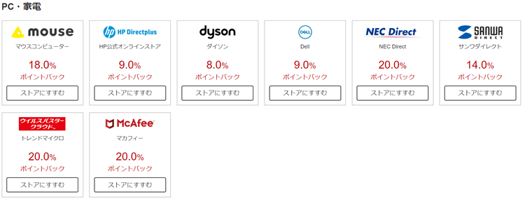 - マウスコンピューター:18%ポイントバック