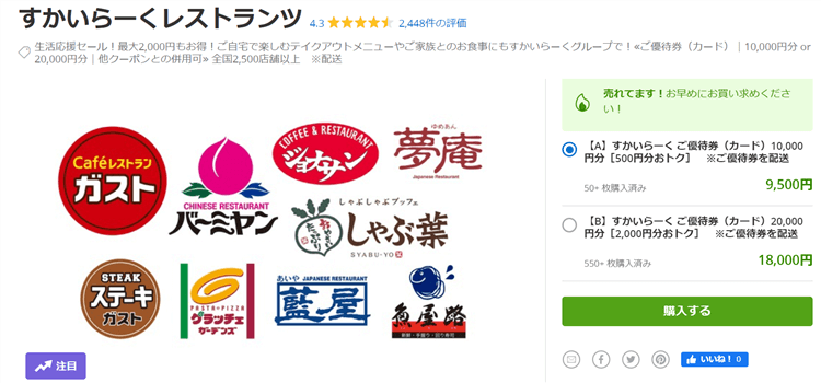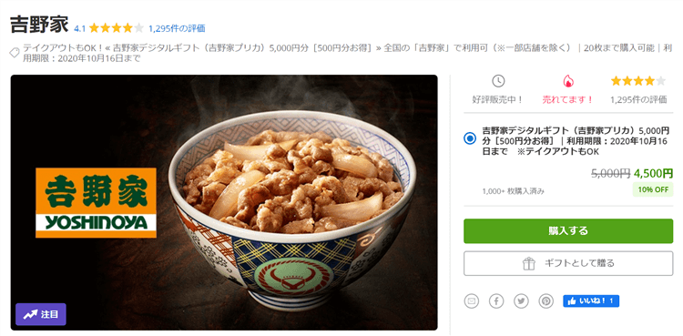 吉野家、すかいらーくが共に10%OFFで購入可能となります。