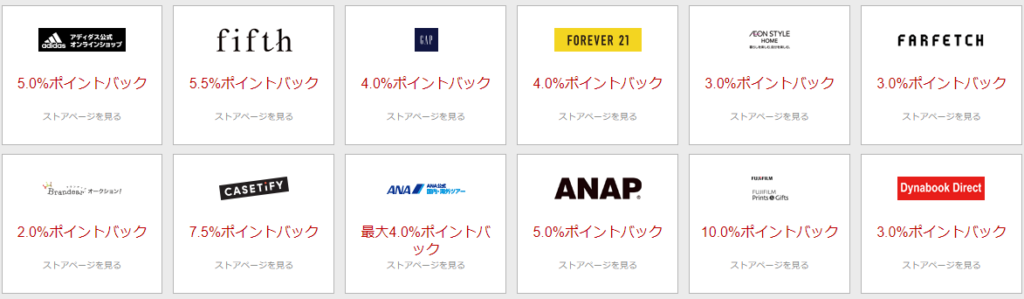 有名なストアの一部と還元ポイント率が下記の通り。
