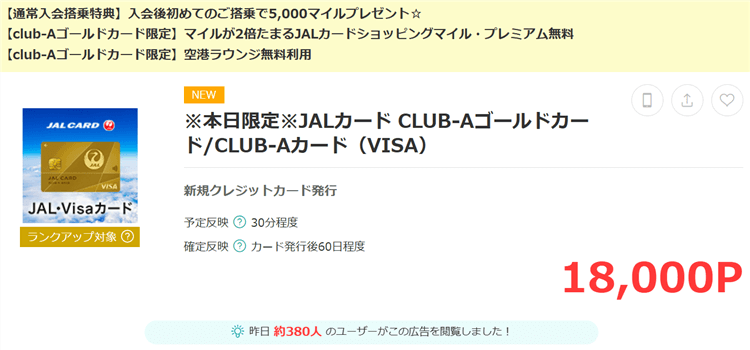 今回オススメしているJALカード CLUB-Aカード/CLUB-Aゴールドカード(VISA)であれば18,000ポイント(18,000円相当)も貰えちゃいますね!!