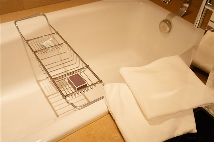 入った右手すぐにはバスタブがあり、その手前にはガウンとバスタオルがしっかりとセットされています。