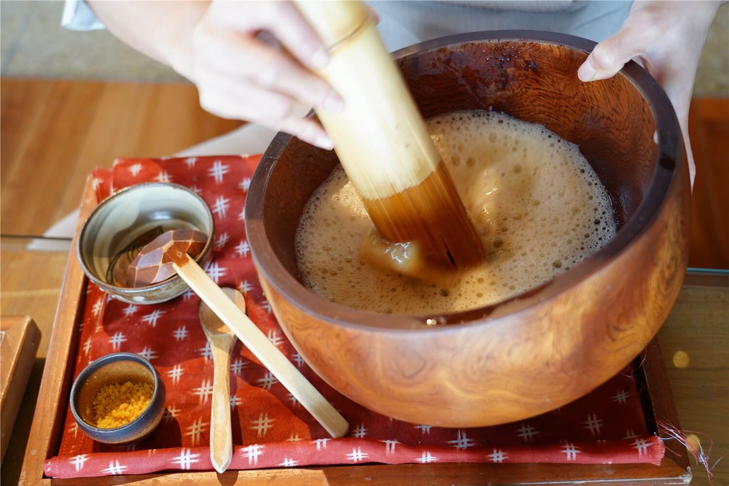 十分に泡立ったら、お茶が入った器に泡を盛り付けていきます。