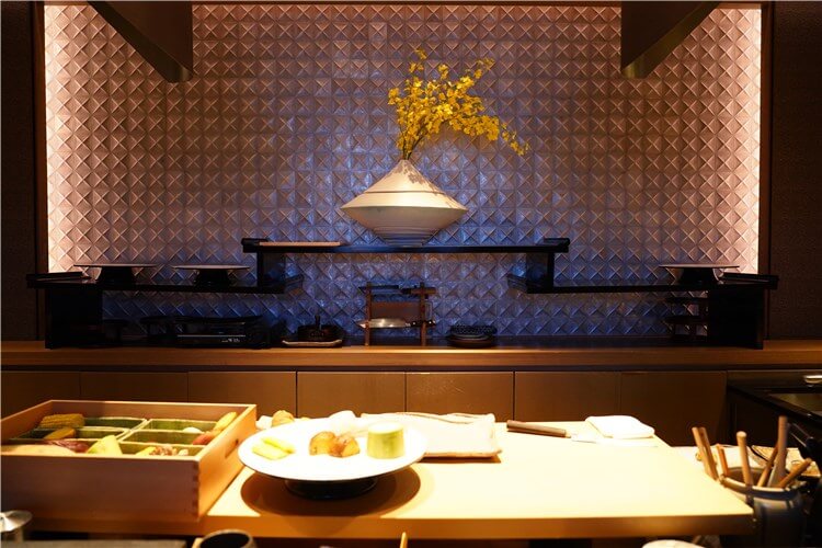 店内の天麩羅カウンターは、日本の「茶室」のイメージでありながらも、細部には金属製のタイルなどを用い伝統の中にもモダンを感じさせる洗練された空間で、こだわりの天麩羅をご堪能いただけます。
