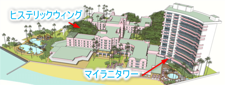 こちらはロイヤルハワイアンホテルの全体図となります。ヒステリックウィング(本館)の左手側にマイラニタワーがありますね!!