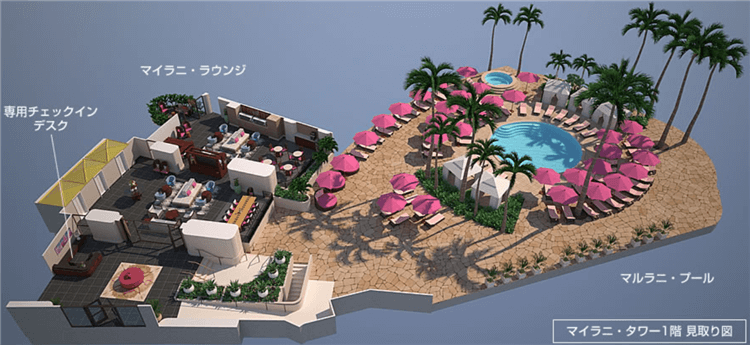 3D見取り図で見るとこんな感じですね!!マイラニラウンジの目の前にはロイヤルハワイアンの名物でもある「マルラニ・プール」があります。