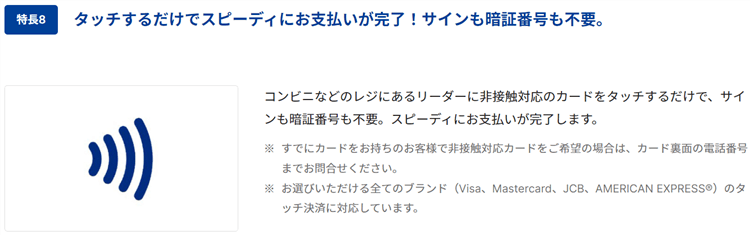 タッチ決済にももちろん対応!サインも暗証番号も不要!
