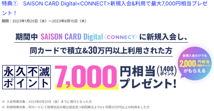 こちらはセゾンカードデジタル CONNECTの新規発行、利用で8,000ポイント(8,000円相当)が貰えちゃいます。