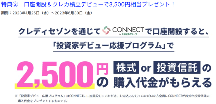 CONNECTで口座開設をすると投資家デビュー応援プログラム適用で2500円分の株式もしくは投資信託の購入代金が貰えます!