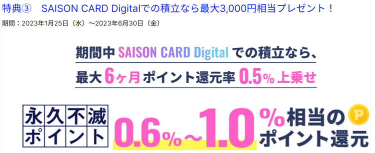 期間中にこのカードで積立をすることによって最大6か月分ポイント還元率0.5%上乗せとなりますよ!!
