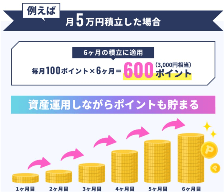 例えば毎月5万円の積立をしたら合計で3,000円相当のポイントが貰えるんです!