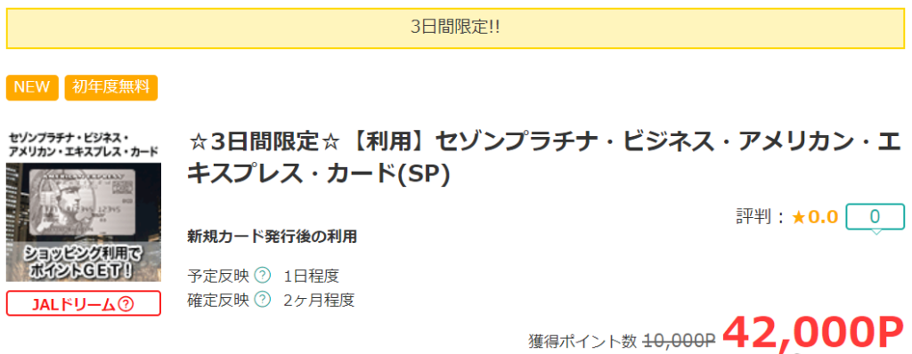 こちらは日本最大級のポイントサイト「モッピー」でセゾンプラチナ・ビジネス・アメリカン・エキスプレス・カードが42,000P(42,000円相当)という強烈還元となります。