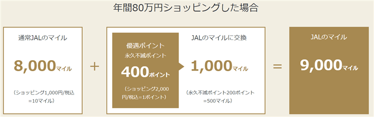 上記80万円の利用の場合、8,000JALマイルにプラス1,000JALマイルが貯まるわけですね!還元率は1.1%となり、JALカードの1%還元よりも高くなります。