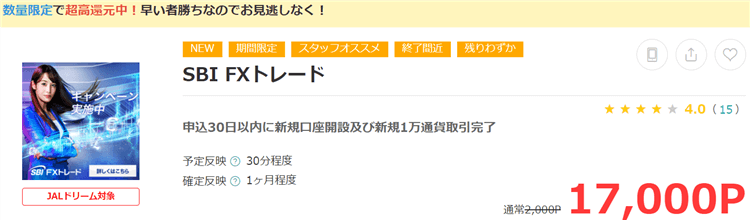 こちらは新規口座開設後に取引を完了したら17,000Pが貰えます。