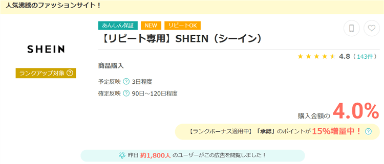 これ、モッピーを経由してSHEIN(シーイン)でお買い物するだけでなんと初回50%(時期によって変動あり)のポイントが貰えちゃうんですよ!!