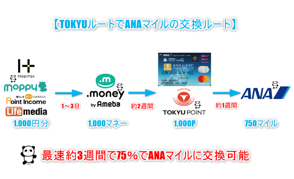 モッピー(あとから15%増量)→ドットマネー→TOKYU POINT→ANAマイル(75%還元)