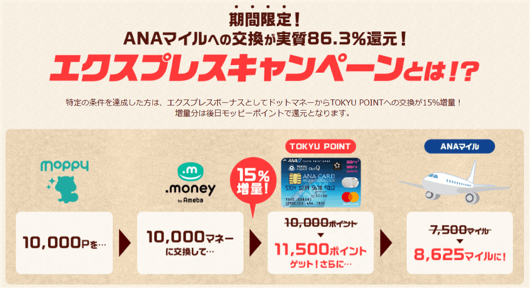 今回のモッピーのキャンペーンは条件をクリアして、こちらのTOKYUルートを利用して10,000P(上限)を交換すると、後からモッピーポイントとして1,500Pがバックされるようになります。