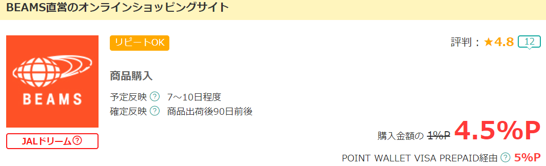これ、モッピーのサイトで「BEAMS」と検索をすると上記のバナーがあり、そこを経由するだけで購入金額の4.5%がモッピーポイントとして貰えるようなっているんです。