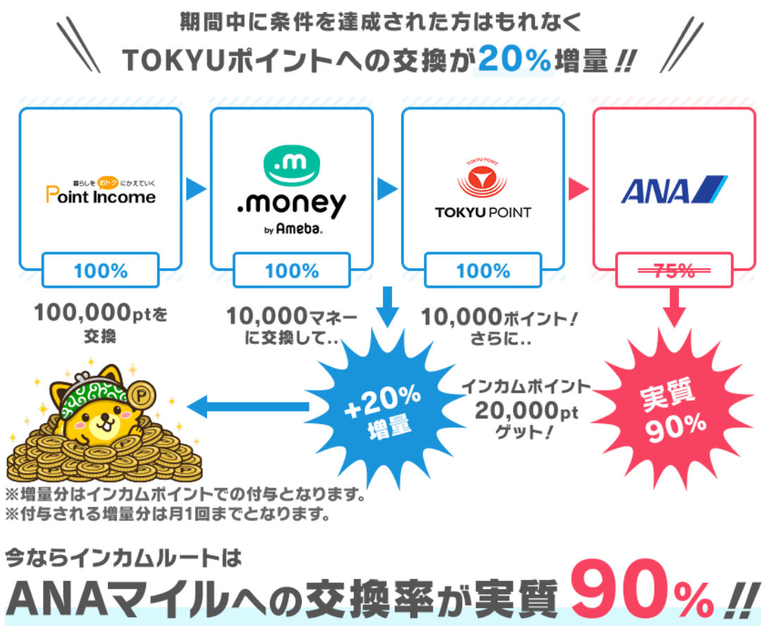 - インカムルートで90%レートで100,000P交換