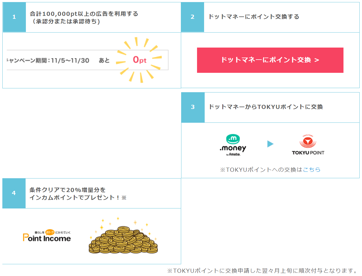 ポイントインカム → ドットマネー → TOKYU POINT に交換したポイント数のみ対象となります。