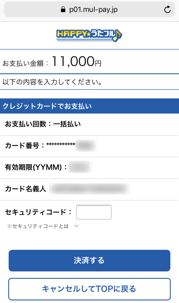 認証が完了すると次は支払い画面となります。自分が選んだコース金額が間違いがないか必ずチェックしてくださいね!