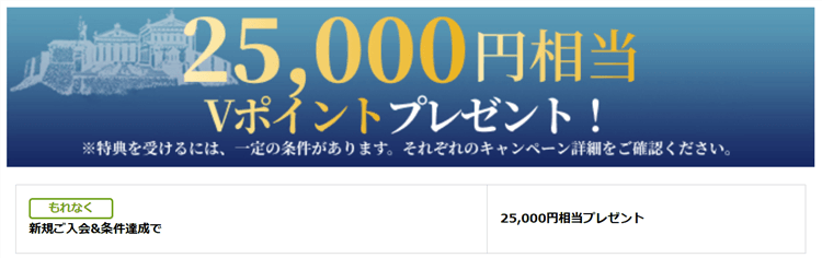 条件は期限内に500,000円以上のカード利用で25,000円相当のVポイントがもらえるキャンペーンになります。