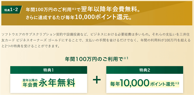 また三井住友ビジネスオーナーズゴールドは年間100万円利用することで10,000ポイントがもれなく貰えるようになっています。