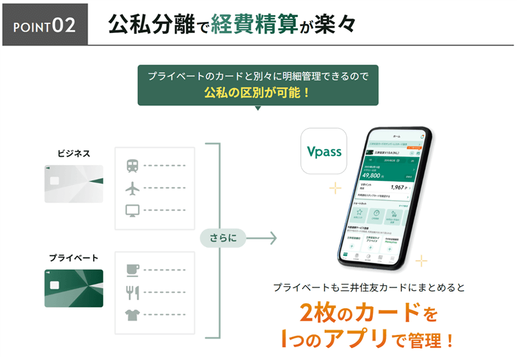 三井住友カード ビジネスオーナーズですが公私分離が出来て経費とプライベートの区別が可能になります。