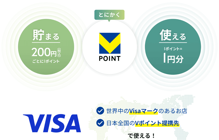 青と黄色のVポイントは、世界のVisa加盟店と日本全国のVポイント提携先で「貯める」「使う」ことができます。
