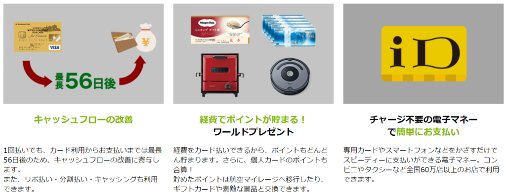 また、三井住友系のクレジットカードはポイントが貯まります。経費での利用であっても、「ワールドプレゼント」のポイントが貯まりますので、こちらは各種商品だったり、マイルに交換したりと非常にお得です。