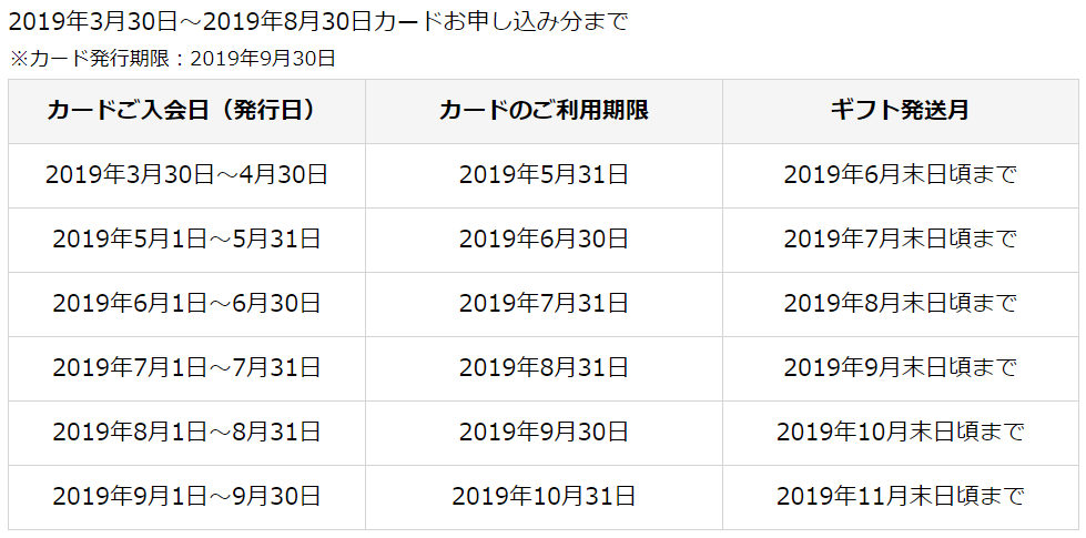 今発行した場合、8月に入会したことになるので9月いっぱい(翌月まで)に5万円以上利用すれば条件クリアとなります。