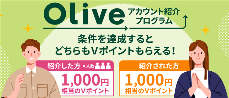 Oliveでは紹介プログラムというものがあり、こちらを利用すると更に1,000円相当のVポイントが貰えちゃいます!!