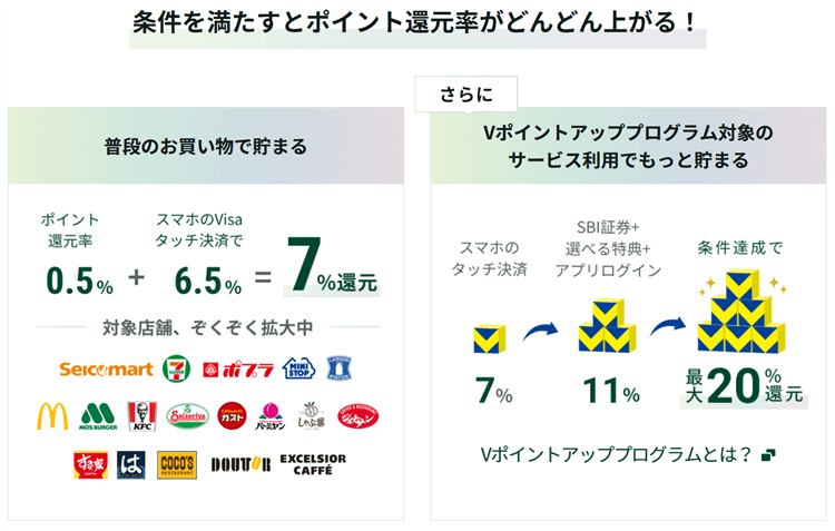 - 特典⑦SBI証券デビュー応援プラン(各種証券取引):特典⑤・⑥を達成した上で、期間中に各種証券取引条件達成で上限14,000円相当のVポイントプレゼント